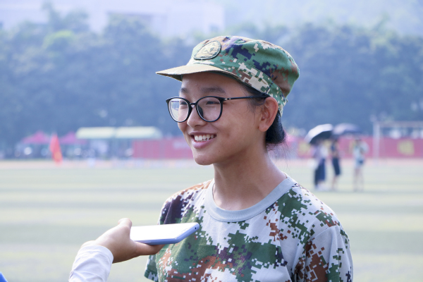 二营六连二排的官师妹分享了自己军训期间的趣事,在进行半个小时的正步定腿时,教官和他们一起唱歌,一起背古文,让时间过得快一些,让那半个小时过得更有意义。
