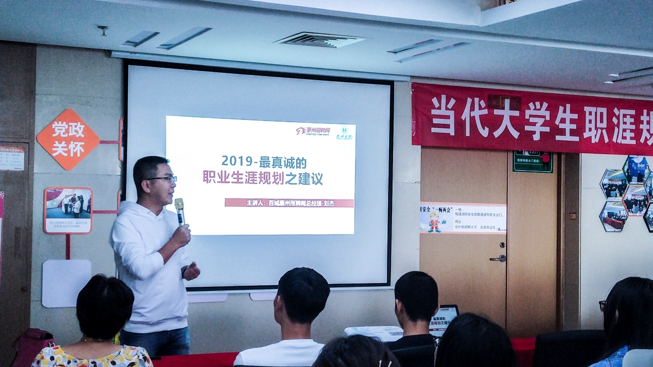 2019年10月19日星期六上午,经济管理学院工商管理系主任徐宁副教授带领16级物流管理专业同学到赛格假日广场,聆听惠州市百城人力资源服务有限公司的总经理刘杰分享讲座。本次讲座围绕“2019年最真诚的职业生涯规划之建议”为主题展开,整个过程同学们都怀着一份兴致勃勃的心情去聆听。