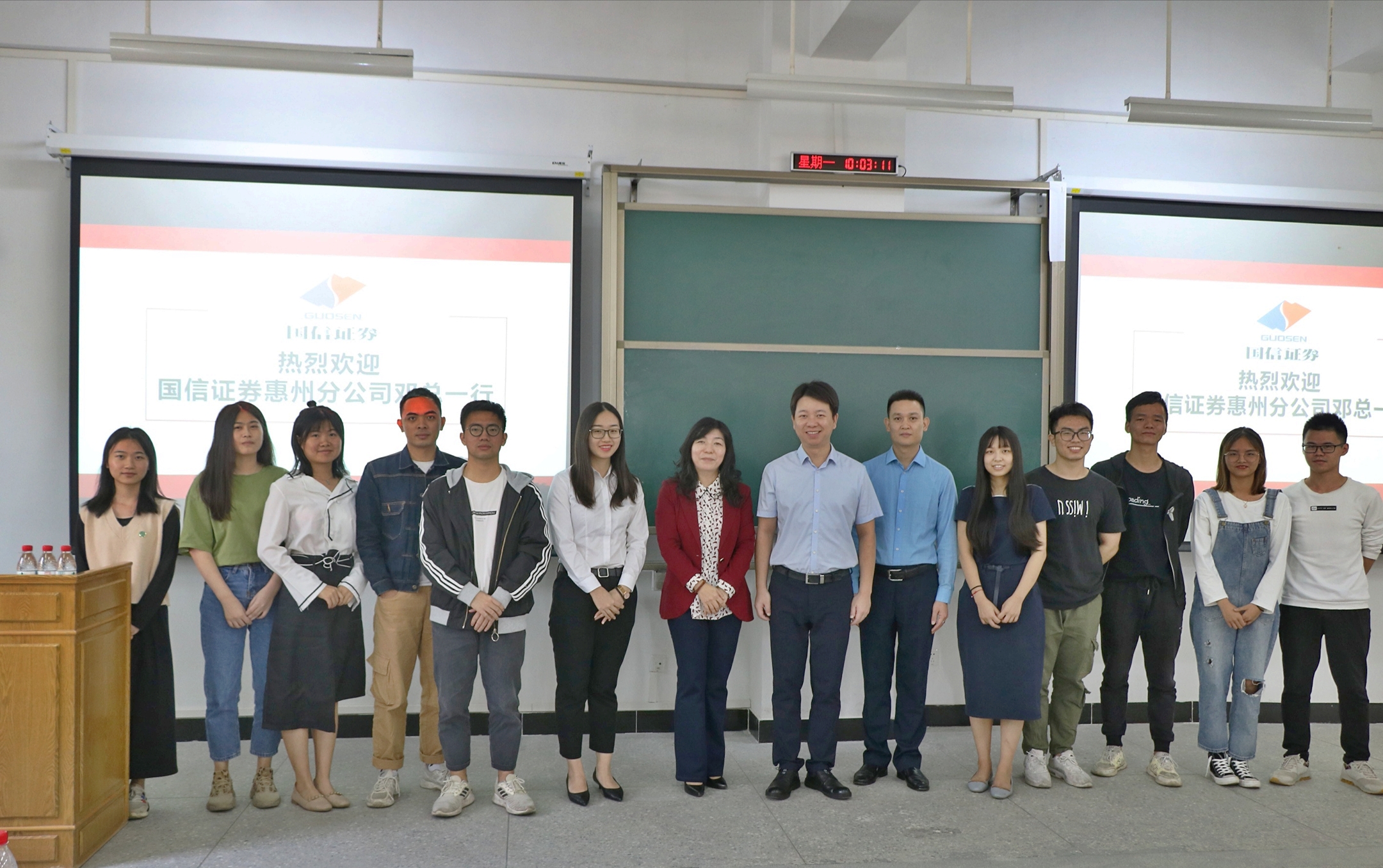11月4日上午,国信证券惠州分公司党支部书记、总经理邓忠先生应邀于旭日楼106教室为经济管理学院的学生授课,本次授课的主题为——迎接财富管理新时代。聆听本次课程的有经济管理学院柴静副院长、邱逸诗老师、国信证券惠州分公司渠道总监彭耀奇先生及秘书何媛女士。