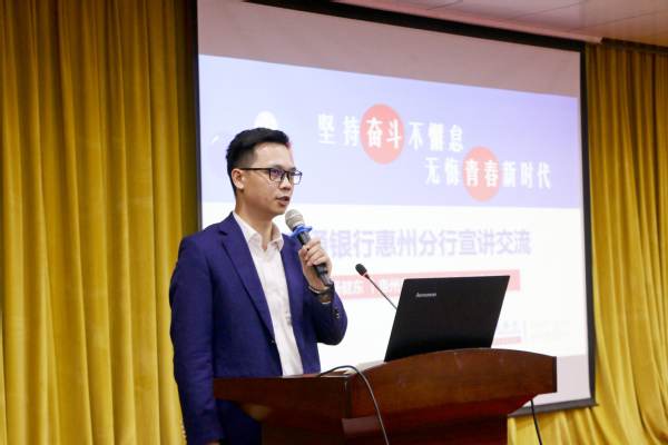 杨建东书记介绍了交通银行的情况,对惠州学院在交行工作的学生评价很高,对在银行实习的学生也充分地肯定。