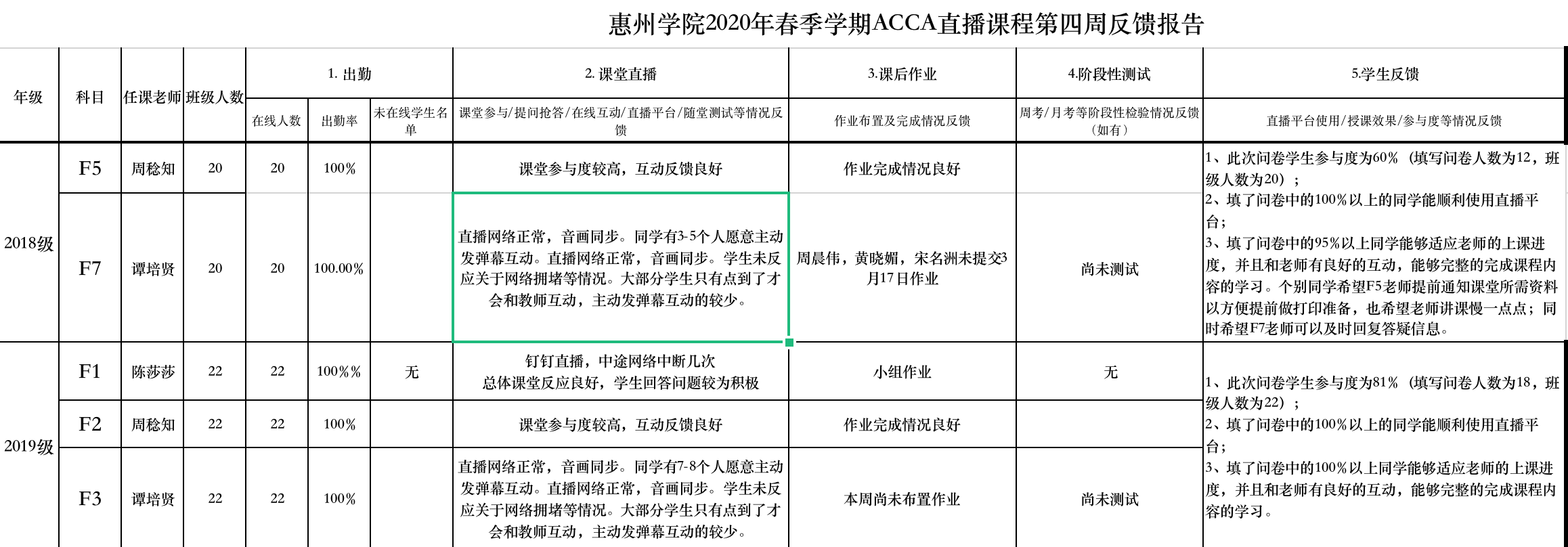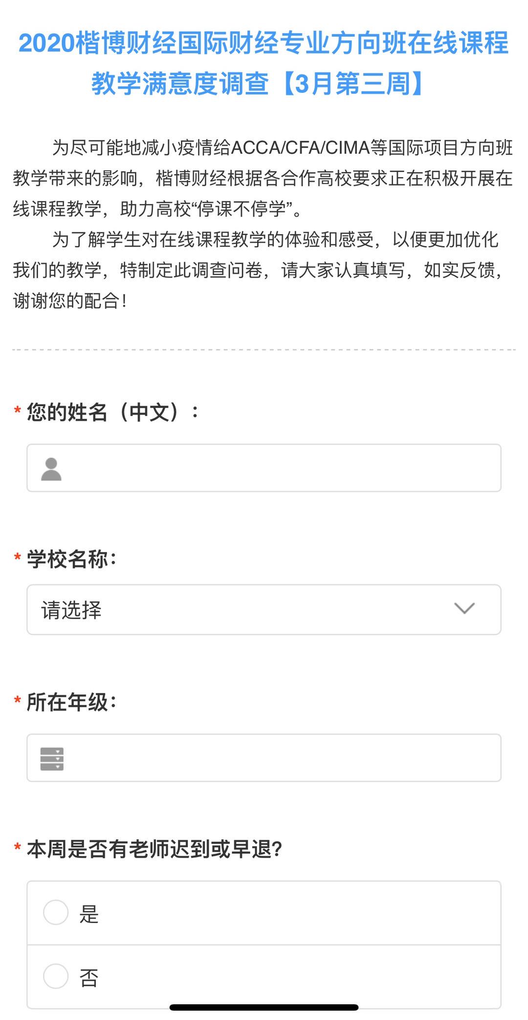根据2018级、2019级ACCA班学生学生春季开设课程,楷博财经教育开通课堂派线上直播平台和QQ/微信交流群,选派教学经验丰富、亲和力强的教师开展授课。通过“课堂教学+课后辅导+每周调研反馈”闭环式学习,将在线考勤、提问、抢答、随堂测试、在线答疑、课堂作业等教学活动形式,与课后直播回放、难点、重点内容的讲解、学习讨论和课后答疑、试题库、作业题加强等方式对知识点的理解和巩固充分结合;每周进行一次问卷调查,集中收集学生对线上课程教学情况的意见和建议,及时掌握线上教学动态,跟进并反馈解决存在的问题。