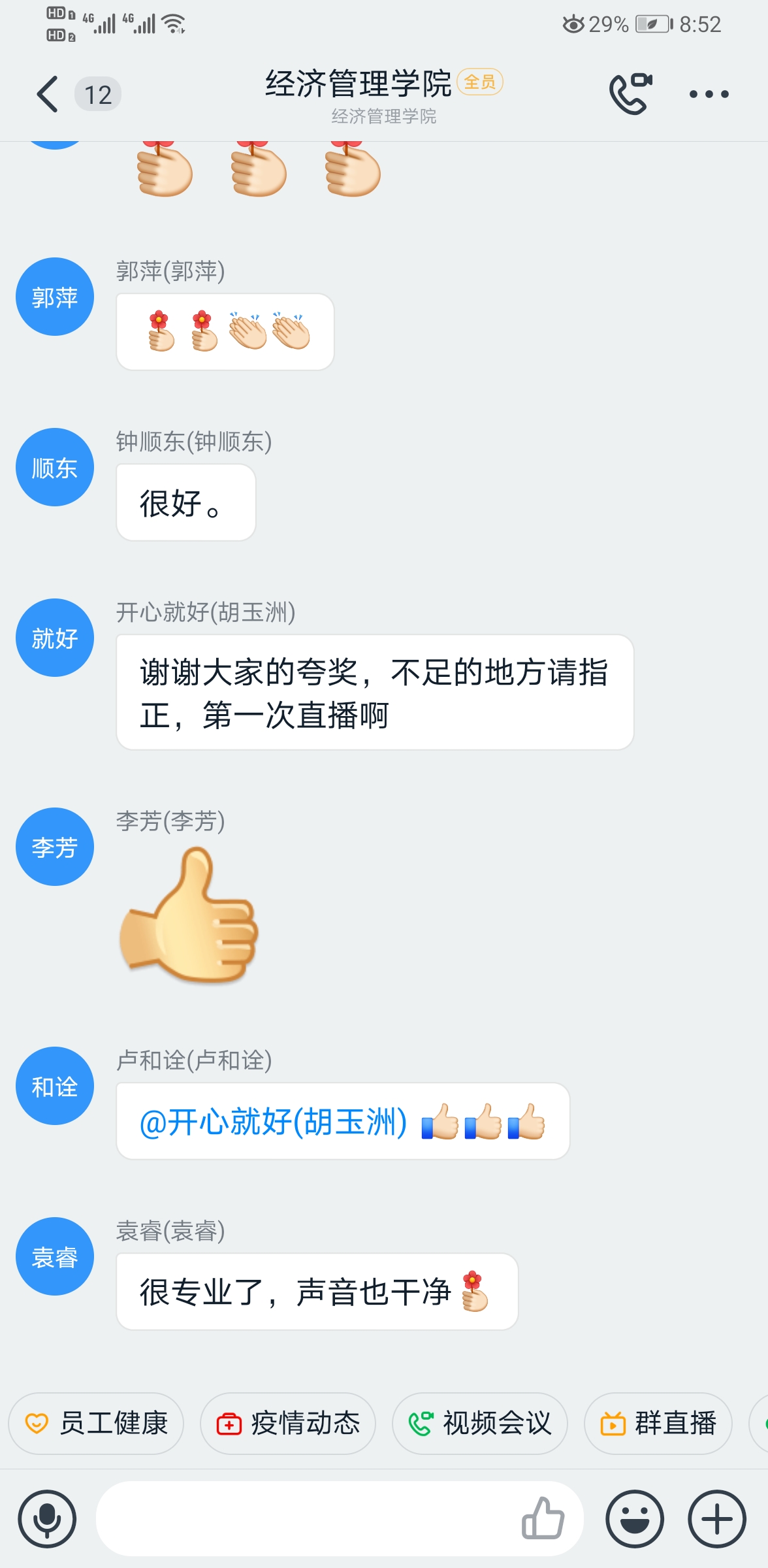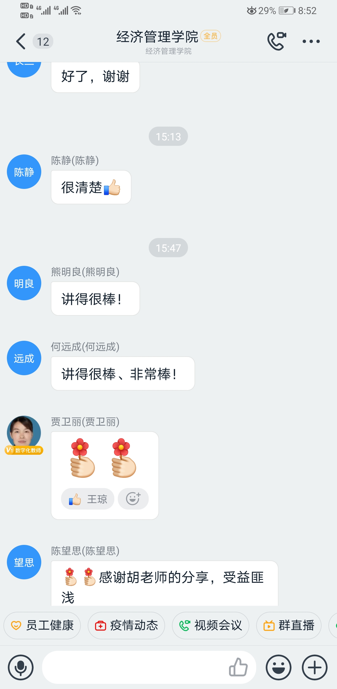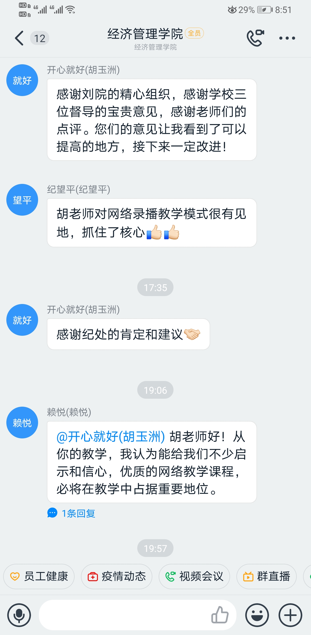 最后,刘春梅副院长总结说,一堂难讲的课讲的如此之生动,再次感谢胡玉洲老师,感谢今天亲临在线课堂的各位督导和老师们。虽然网络有距离,但是我们一起为学生、向上、追求美好的心是一样的,“天涯若比邻”!希望通过此次系列活动我院在线教学迈上更高的台阶。