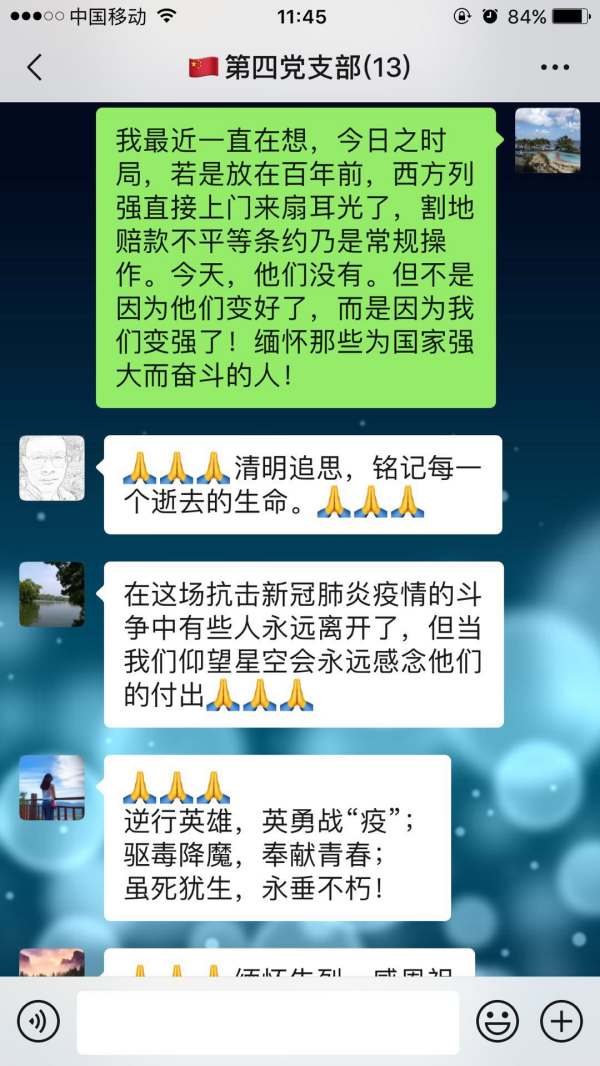 来自我院的一位同学这样说道:“四月四日全国深切哀悼抗疫烈士与逝世同胞,让人们看到我们并没有忘记他们,哪有那么多的岁月静好,只不过是有人在为我们负重前行。”