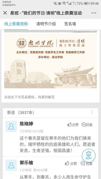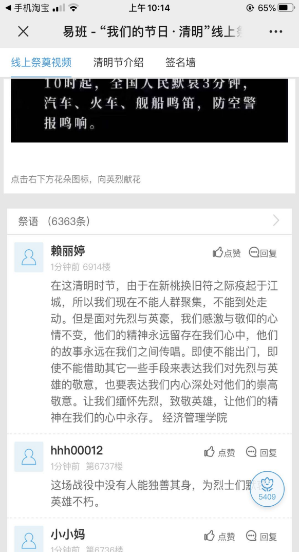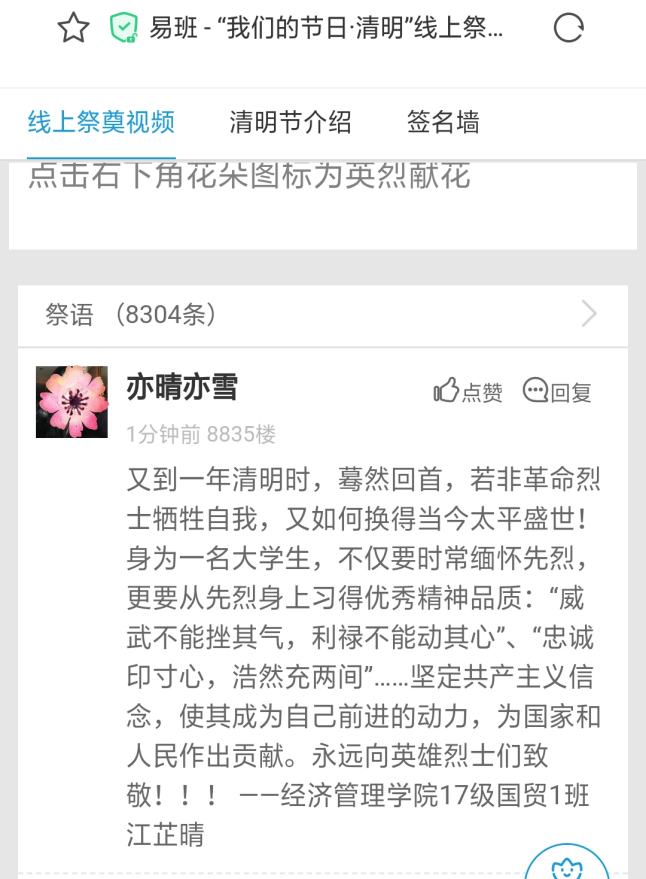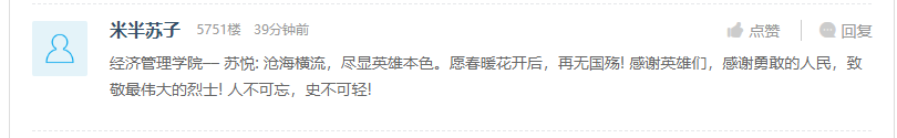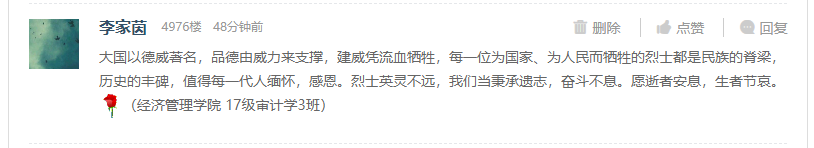 追思,是为了仰望;缅怀,是为了前行。在参加了这样一场触动人心的活动后,我院众多师生纷纷通过网上献花、留言等形式表达对英烈的追思与敬仰,以及继承革命传统、弘扬民族精神、发扬先烈遗志的决心和打算。