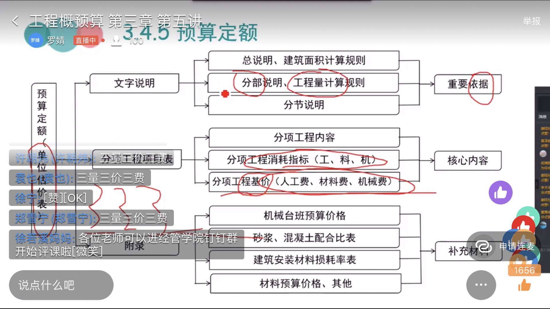 14:10分,各位听课专家纷纷进入罗婧老师钉钉直播的《工程概预算》课堂。罗老师从学生上节课作业完成情况开始,首先讲解了做题思路和重要知识点,随后用“二环夜临大水支架已安稳”顺口溜式的知识点记忆法,让学生更好地掌握材料预算费用的内容和计算方法。