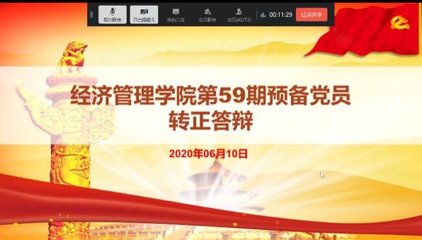 为保证学生党员队伍建设的科学性、系统性, 严把党员“入关口”,6月10日上午,经济管理学院在1508会议室及钉钉线上平台举行第59期预备党员转正答辩暨第61期预备党员入党宣誓会议。院党总支书记郑良才、党总支副书记祝琳、辅导员、及相关预备党员参加了本次会议。