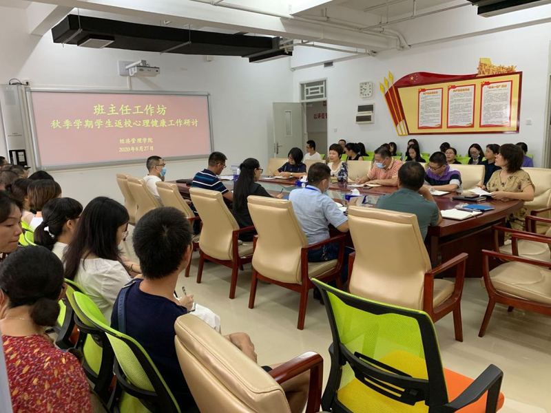 为进一步加强辅导员、班主任队伍建设,切实做好疫情防控常态化下的学生心理健康工作,8月27日上午,经济管理学院首期班主任工作坊暨2020年秋季学期学生返校心理健康工作研讨会在1508会议室举行,我校心理健康与咨询中心主任钟小川应邀为与会人员作了《心理危机的识别与干预》专题报告。经管学院党总支书记郑良才、全体班主任和辅导员参加了会议,会议由党总支副书记祝琳主持。