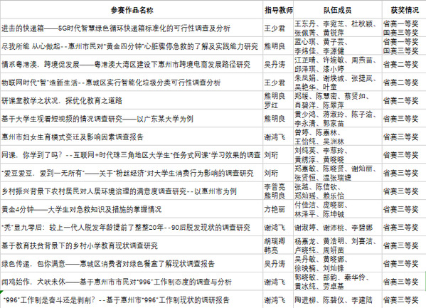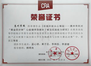 为引导大学生创新和实践,提高学生的组织、策划、调查实施和数据处理与分析等专业实战能力,培养学生的社会责任感、服务意识、市场敏锐度和团队协作精神。惠州学院团委和经济管理学院联合主办“正大杯”第十届全国大学生市场调查与分析大赛校级赛,校赛中共有16支队伍冲出重围,晋级省赛,取得优异战绩。最终2支队伍分别获得国赛三等奖和省赛一等奖,3支队伍获得省赛二等奖,11支队伍获得省赛三等奖。