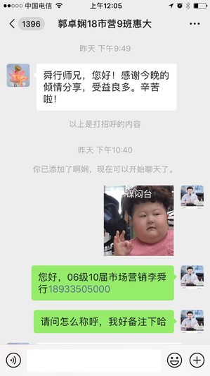 第一点:越学习越自信:他分享了因为善于学习营销自我的理论和平时有意识的实操训练学习经历,让他通过六轮筛选成功加入竞争非常激烈的央企-中国电信,他以PK掉许多名校毕业生的求职经历告诉师弟师妹们,我们这类二本院校,只要你通过学习让自己足够优秀,也会争取到许多难得就业机会的。