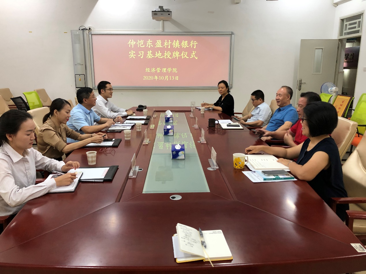2020年10月13日下午,经济管理学院与仲恺东盈村镇银行在教学实验楼1508会议室举行实习基地签约授牌仪式。经济管理学院院长王兴邦、党总支书记郑良材、副院长陈秋锋,副书记祝琳,仲恺东盈村镇银行行长曾志来、副行长陆惠娟、综合部管理部负责人黄允裕、综合部姚富娣出席授牌仪式。
