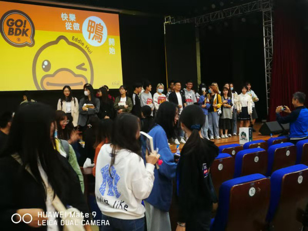 在激动人心的有奖提问环节,同学们踊跃提问。许先生在回答同学们的问题时谈到在创业过程中要一直坚持学习,在遇到困难时要调整好心态,随着时间的推移不断提升自己的能力。克服困难就是一个试错的过程,犯错后懂得避免即可,每天都会有困难的产生,保持良好的心态才能不断克服困难。在公司运行过程中,他相信每一位员工都具有潜力,所以他并没有过多严格的要求员工的行为。就小黄鸭品牌而言,最重要的是坚持Be Playful,一定要多涌现一些新鲜有意思的想法。只要人一开始就把分内的事情做好,才有机会往前走,并且在此过程中要坚守初心,由点及面,才能使一个企业越做越强。