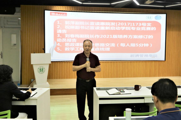 11月26号下午,经济管理学院于教学实验大楼501跨专业综合模拟实验室召开全体教职工会议,主要围绕着教学管理、2021版人才培养修订、课程思政教学设计分享主题开展。本次会议由王兴邦院长主持。