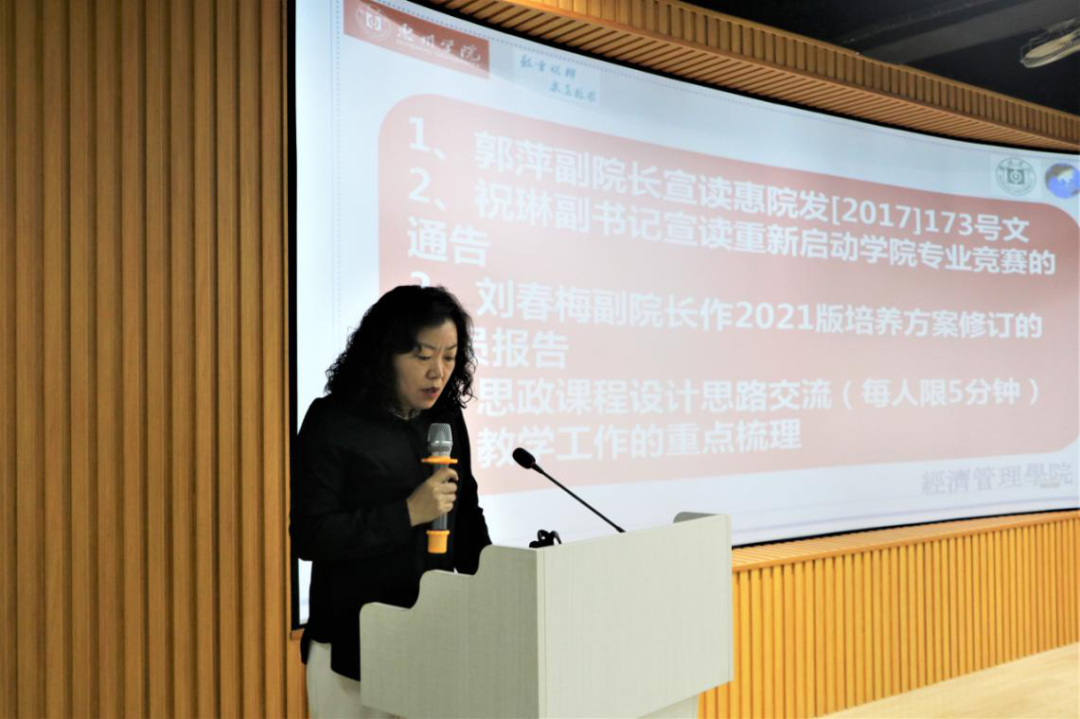 祝琳副书记宣读重新启动学院专业竞赛的通告。她提到学科竞赛对学生实践能力的提高有着显著效果,应广大师生的呼声,我院重新启动了专业竞赛。其中专业对应竞赛名称有:财务管理专业投资理财大赛、国际经济与贸易专业贸易谈判大赛、市场营销专业营销策划大赛、物流管理专业物流设计大赛、审计学专业内部控制大赛。专业竞赛的相关细则将在后续进一步完善。