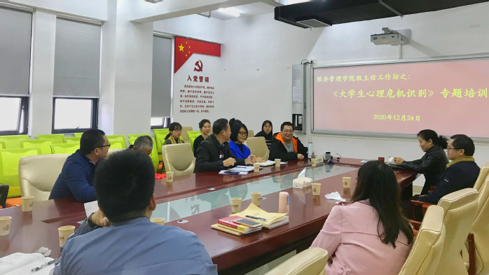 2020年12月24日,经管学院举办第四期班主任工作坊,邀请校心理咨询中心常务副主任何资桥博士作题为“大学生心理危机的识别与干预”专题讲座,学院党总支书记郑良才、副书记祝琳、全体辅导员和班主任聆听了讲座。