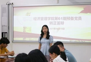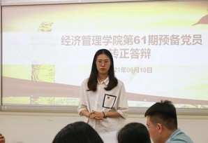 6月10日下午,经济管理学院在11号楼1508会议室召开第61期预备党员转正答辩暨第63期预备党员入党宣誓仪式。经济管理学院党总支祝琳副书记、学生党支部书记、第61期预备党员、第63期预备党员参加了此次活动。结合疫情防控实际,7名在惠州市外的毕业生党员同步参加了线上会议。