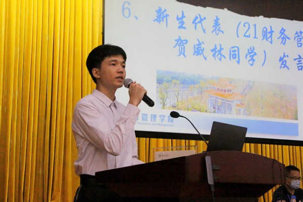 21财务管理1班贺威林同学作为新生代表发言,他表示会好好把大学四年利用起来,努力学习拼搏向上,给自己树立一个目标并为之不懈努力!拥有一个充实,快乐的大学生活。
