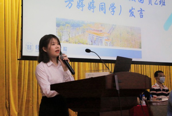 19级国贸2班方婷婷同学作为老生代表发言,她分享了自己过去两年的大学生活。鼓励师弟师妹在好好学习的同时也要多做一些有意义的事情,大学要敢于有梦,敢于追梦,充实愉快的度过大学四年美好时光。