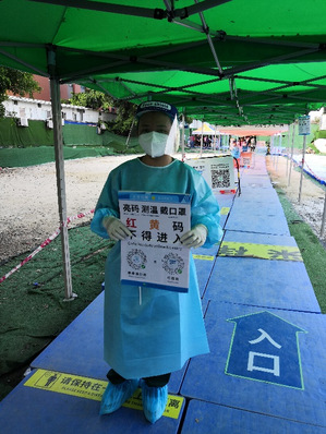 此次志愿服务,让我感触良多。我们的工作内容不算繁重,但由于天气炎热,口罩密闭性也比较好,所以刚工作一个小时就会感觉闷得透不过气,防护服里的手术服也很快就湿透了,手套也很明显看得出“溢水”。对于这样的工作环境,我们只是在参与这种志愿服务时才会经历,但是医护人员却是长期的值守。在我们负责的第一道关口,有两个医护人员与我们一起工作,在休息间隙的交谈中,也了解到她们的辛苦。