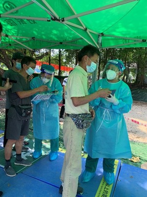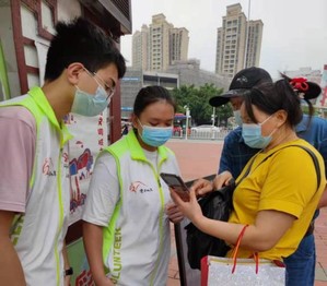 我们主要在核酸检测区的第一道关口帮忙。首先是要对前来受检的民众进行健康码和行程码的双码检查,保证此通道所有人手持绿码。在检查完双码后,我们会询问对方是否有挂号预约,对于尚未挂号预约的民众,指导其扫描医院公众号二维码,绑定身份证建档,进行挂号预约。对于部分手机网络不太通畅或不太会操作手机的受检民众,我们会指引其到人工填单挂号的地方或帮其进行手机操作。