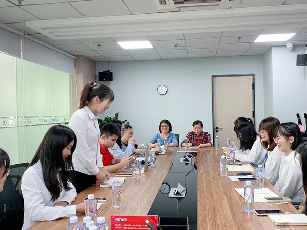 惠州市万科企业有限公司HR丁凡和数字销售营销经理吴贤辉对学院领导老师的到来表示热烈欢迎。丁凡介绍了万科公司的人才招聘政策,表达了与经管学院深化校企合作的愿望。吴贤辉介绍了万科公司针对实习学生配备专业导师和职业导师的双培养计划,对实习生的表现给予了高度评价。郭萍副院长感谢万科公司给我校学生提供的良好的实习工作机会,她仔细询问了实习期间的具体安排。