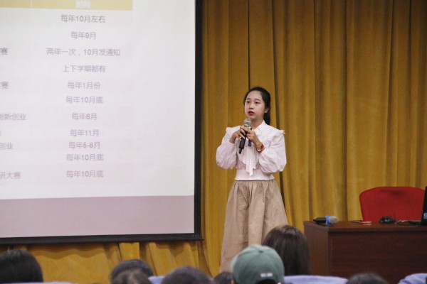 紧接着,2019级物流管理专业的周韋伶同学分享了她的大学学习与生活。品学兼优的她以大学四年的时间为主轴线,用思维导图的方式,把自己认真学习、积极参加竞赛、热情参与干部和团队选拔等获得的成绩与经验与大家共勉,她建议大家做好大学规划,做好时间管理,充实自己的大学生活,不断激发出自己对学习的兴趣与挑战,从而积累和完善自己。