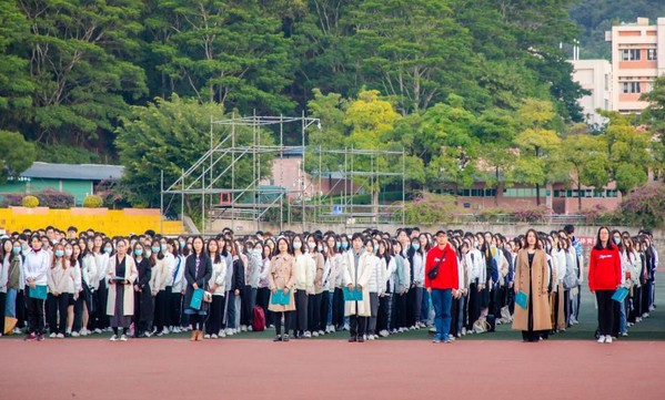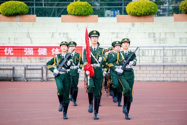 校园的清晨静谧美丽,6点30分,参加仪式的师生已经列队完毕,全体师生精神饱满,怀着期待的心情,等待着仪式开始。