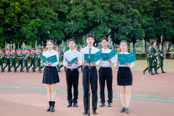 升旗礼毕,全体师生集体诵读誓词:“国旗在我心中,神圣不可侵犯;对祖国和人民饱含敬意;对先烈和文化满怀敬仰;对学习和工作心存敬畏;国旗国歌唱响心底。”