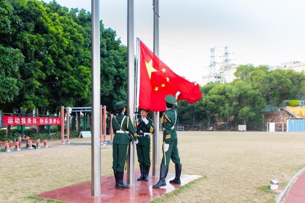 6点55分,国旗护卫队护送着鲜艳的五星红旗,身着礼服,迈着矫健的步伐入场。当嘹亮的国歌响起,五星红旗冉冉而升,在这庄严肃穆的时刻,师生们集体行注目礼,表达对祖国的热爱与骄傲之情。