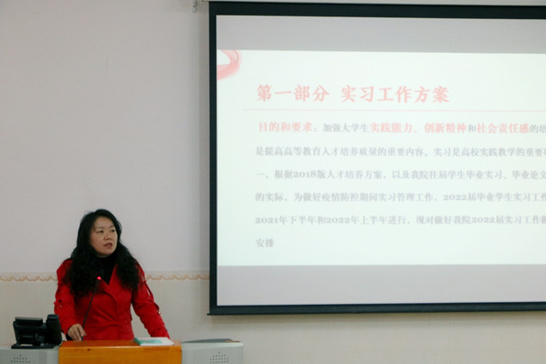 经济管理学院郭萍副院长为毕业生分别讲解三种不同类型的毕业实习要求,针对毕业生实习的组织与管理进行解释和说明。她表示实习工作是加强大学生实践能力、创新精神和培养社会责任的渠道,是提高高等教育人才培养质量的重要内容。她希望企业用人单位对学生多一点包容、多一点爱护、多一点接纳、多一点帮助,促进共同成长。最后,她赠予大家“三心二意”一词,即有责任心、上进心、感恩心以及界限意识、真诚意识,希望大家能肩担时代使命,踏实能干,吃苦耐劳,眼里能容下星辰大海和万丈光芒。