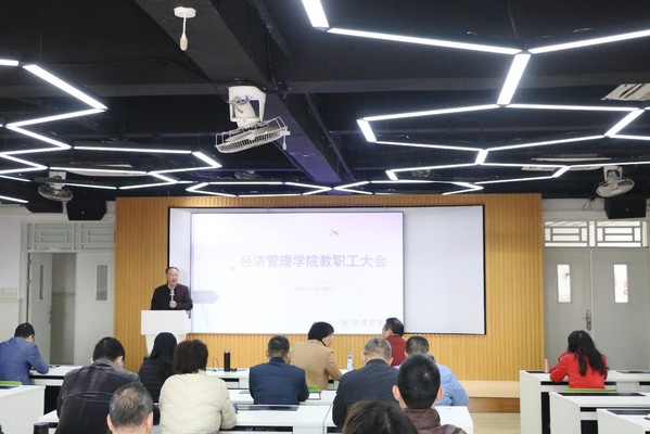 2021年12月30日上午,经济管理学院在旭日科技大楼B座501教室召开全院教职工会议,进行领导班子述职述廉和学术委员会、教学指导委员会、督导委员会、学科竞赛委员会“四委”换届聘任。