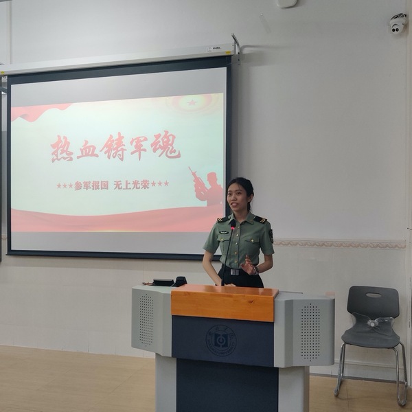潘秀恩同学有两年的参军经历,曾获“优秀义务兵”称号,她向大家介绍了入伍的条件、程序。她提出,有参军意愿的同学可以结合自身实际,考虑是否以应届生身份入伍,同时也要在规定时间内登录全国征兵网进行登记报名。潘秀恩师姐还向大家介绍了军人优抚政策以及国家和广东省对大学生入伍的优惠政策。她讲述了自己服役期间丰富多彩的活动,并分享了自己当兵的心得,虽然最开始入伍是心血来潮,但后来在父母支持下坚定自己选择,如今退伍后回想起服役期间并不觉得苦。