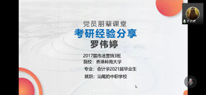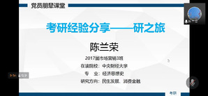 为进一步发挥党员先锋模范作用,助力经管学子考研之行,5月21日晚,经济管理学院学生第一党支部组织开展第三期党员朋辈课堂活动,由成功考取中央财经大学研究生的党员校友陈兰荣和考取香港岭南大学研究生的校友罗伟婷分享考研后的学业生活和工作规划,50余名同学通过腾讯会议参加了此次活动。