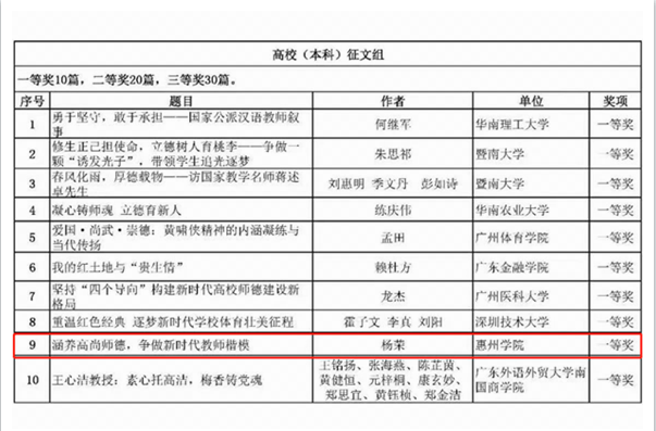 近日,广东省教育厅公布了第十一届师德主题征文及微视频活动获奖名单。我院杨荣老师作品《涵养高尚师德,争做新时代教师楷模》荣获一等奖。