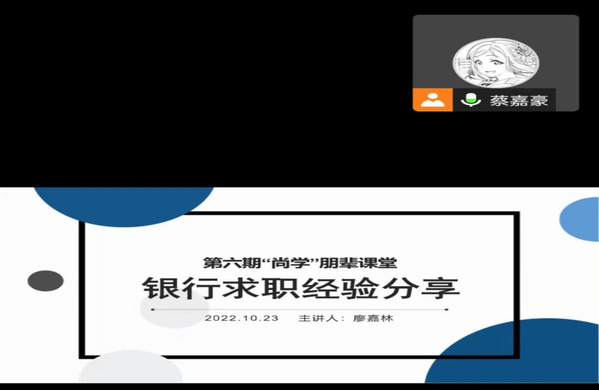 为发挥党员先锋模范作用,助力经管毕业生秋招之旅,10月23日晚,经济管理学院学生第一党支部开展第六期“尚学”朋辈课堂活动,由入职中国银行的2018级毕业生党员廖嘉林分享银行求职经验,30多名同学通过腾讯会议参与了本次活动。