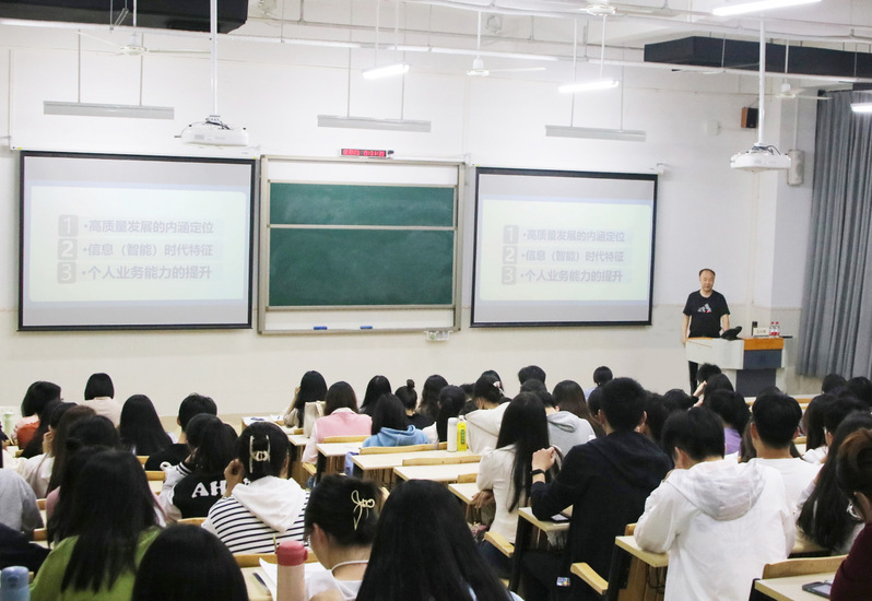 3月9日晚,经济管理学院王兴邦院长以“聚焦高质量发展之信息能力提升”为题,在旭日科技大楼B座107课室讲授新学期思政第一课。党总支副书记祝琳、辅导员葛菁菁、全体学生党员和学生干部聆听了此次授课。