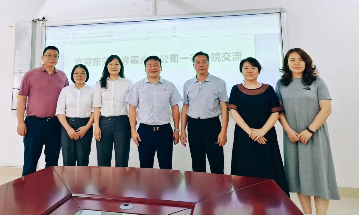 5月22日下午,东莞证券惠州分公司总经理梁永昌、副总经理邹莎和区域总监黄燕玲一行三人来我院开展校企合作交流,经济管理学院党总支书记郑良才、副院长郭萍、副院长刘春梅、财务管理系主任袁祥勇参与座谈交流。