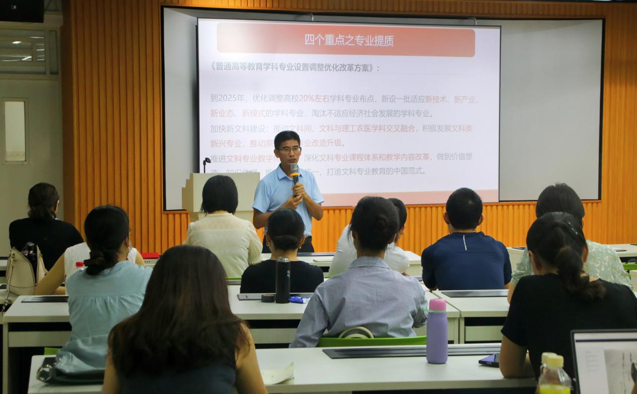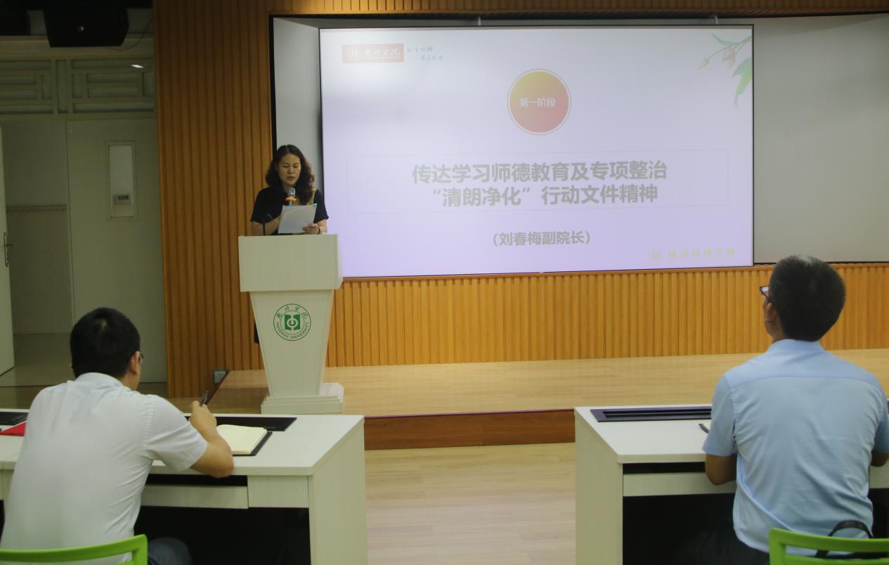 刘春梅副院长结合学校师德集中学习教育及专项整治“清朗净化”行动,对学校相关文件进行领学,倡导教师们要严格遵守教师行为准则,争做“四有好老师”,当好“四个引路人” ,努力做“经师”“人师”相统一的“大先生”,凝心聚力为党育人、为国育才。
