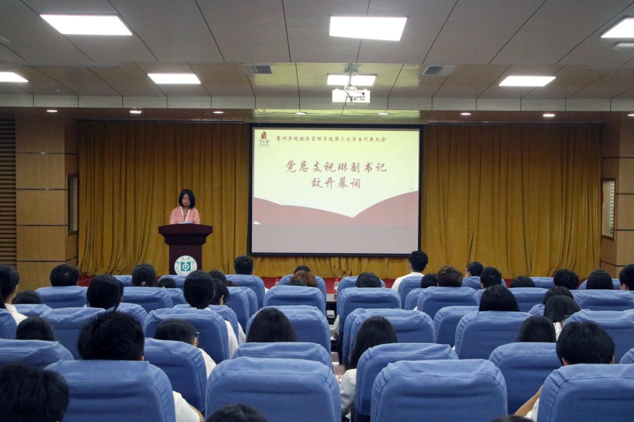 11月5日上午,惠州学院经济管理学院第三届学生代表大会在图书馆报告厅举行。学院党总支副书记祝琳、全体辅导员老师、学院学生会及各兄弟学院学生会主席团代表、126名学生代表参加了此次大会。