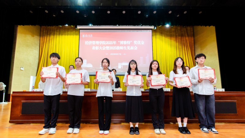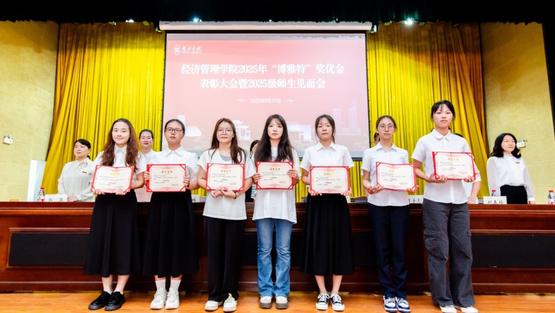 9月17日下午,经济管理学院2025年“博雅特”奖优金表彰大会暨2025级师生见面会在鹅城会议厅顺利举行。副校长魏晓慧,惠州学院杰出校友、2006届财务管理专业毕业生、惠州市现代职业技术学校董事长兼校长叶治斌,惠州市现代职业技术学校副校长罗凯如,经济管理学院相关负责人和师生代表及2025级全体新生参加活动。活动由经济管理学院党委书记史楠主持。