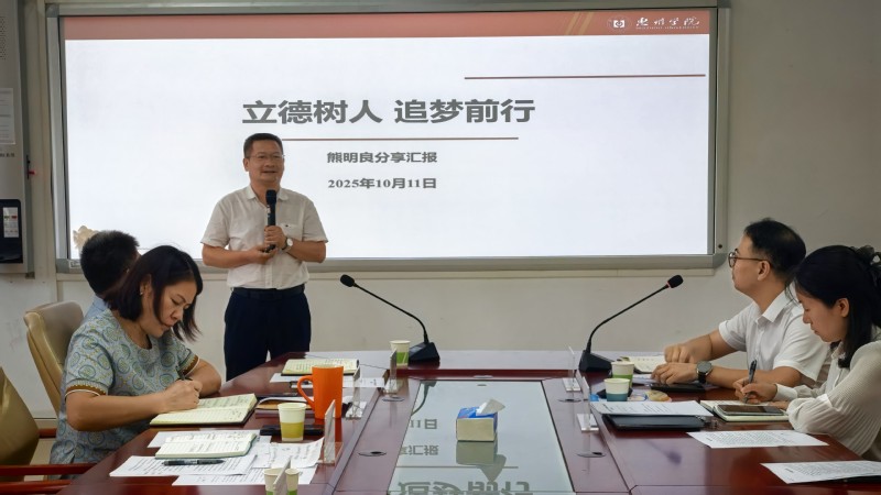 2025年南粤优秀教师熊明良教授以《立德树人追梦前行》为题作经验分享。他分享了近年来在课程建设、科研成果转化、学生考研就业指导等方面的工作成果。他特别强调“做有情怀的教育人”这一理念,提出教师既要成为学生知识学习的“引路人”,更要成为学生品格塑造的“示范者”。其真挚的育人情怀、扎实的工作作风和丰硕的育人成果,引发全体教职工强烈共鸣。