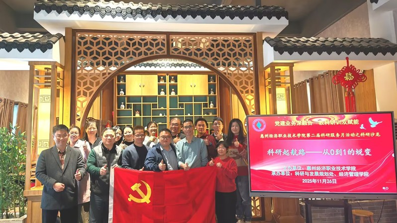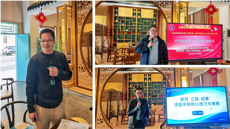 11月26日下午3时,经济管理学院在第四教学楼茶艺实训室顺利举办科研沙龙活动,本次沙龙活动的主题是:“科研起航路——从0到1的蜕变”。经济管理学院全体教职工参会,沙龙由饶志平副院长主持。活动特别邀请惠州学院经济管理学院黄甫博士和我院陈宏寿博士担任分享嘉宾,围绕科研实操核心环节展开深度讲解,内容详实、干货满满,为教职工科研入门提供了切实指导。