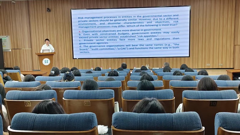 沈征以自身考取相关证书的经历为切入点,结合多年教学与行业研究经验,阐述了对审计领域的认知及资格证书考取的重要意义。她引用《内部审计实务标准》等审计领域经典著作的核心观点,明确了内部审计在组织风险管理、内部控制与治理优化中的关键作用,让同学们深刻认识到内部审计与组织发展的紧密关联性;以全英文形式系统呈现了国际注册内部审计师协会(IIA)资格证书考试体系的核心框架,重点解读了国际注册内部审计师(CIA)与注册风险管理确认师(CRMA)两大核心证书的报考条件、考试科目及能力要求。