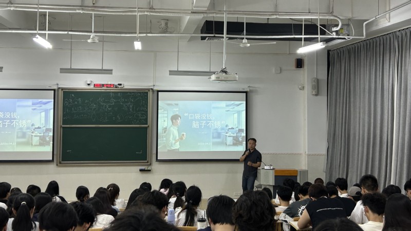 在简短的自我介绍之后,姚鸣珂围绕四个核心观点展开分享:创新创业要从兴趣出发,只有热爱才能产生持续的热情与想法;要多走出去看、多观察、多感受,机会往往藏在真实生活的细节中;全力拥抱AI,这是当代年轻人必须掌握的基本功;创新必须有韧性,每一次失败都在为成功铺路。他最后送给同学们两句话:“你现在的点滴,会串联起未来的道路”,以及乔布斯的名言——Stay hungry, stay foolish。